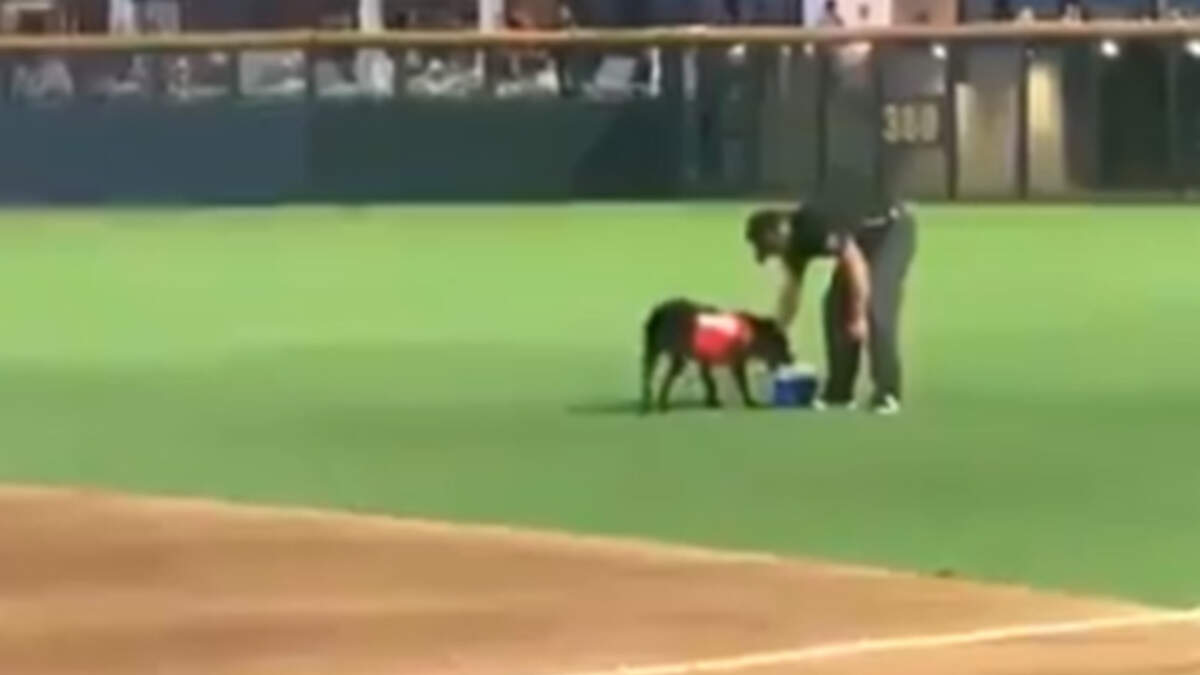 Finn, the 'bat dog' for the Las Vegas Aviators, was given some extra duties during Thursday night's game against the El Paso Chihuahuas. As the temperature in Vegas soared into the 90s Finn was given a blue cooler filled with water to bring to the umpires in between innings.